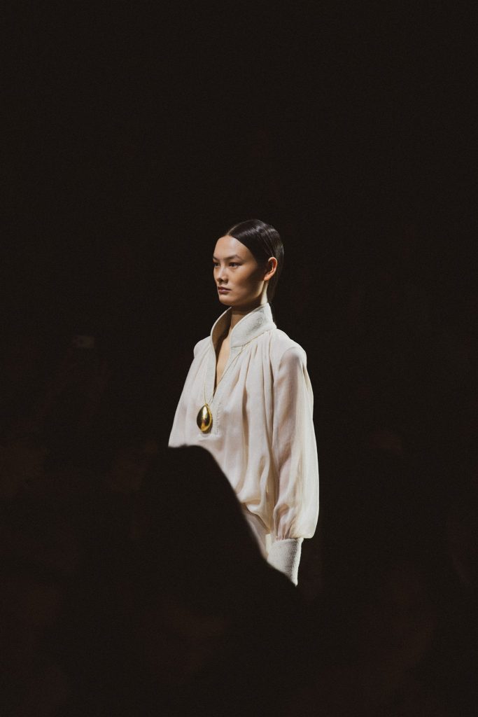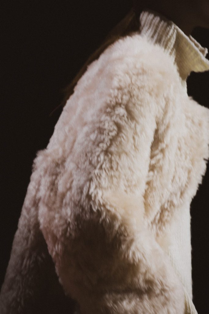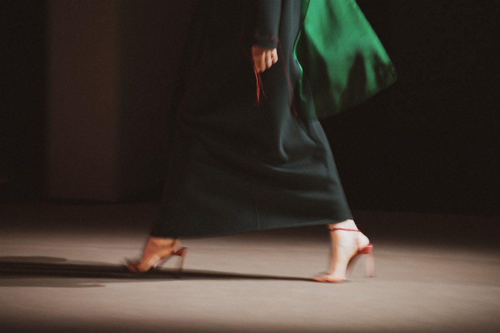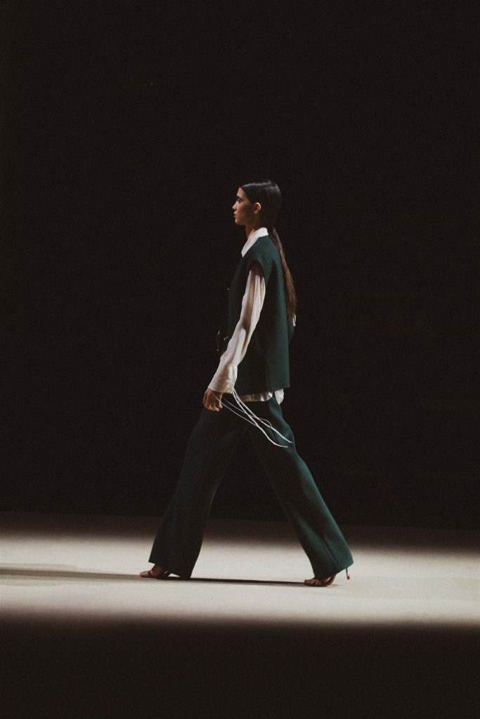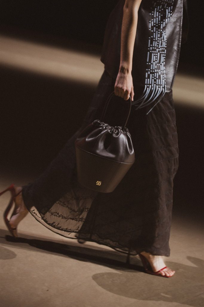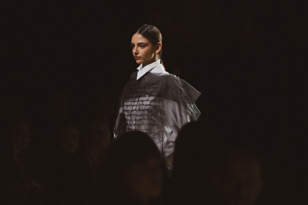 Desde el diseño, SIMORRA traduce este concepto en una colección que explora el tejido como superficie de escritura. Caligrafías bordadas a mano, a veces visibles, a veces ocultas, recorren tejidos que van desde la gasa hasta el paño. Tiras de texto impreso en napa se entrelazan como hilos, recordando que las palabras, como los tejidos, se construyen en relación. Micro-caracteres metálicos cosidos uno a uno atraviesan las costuras, componiendo mensajes que se descubren en el detalle.
