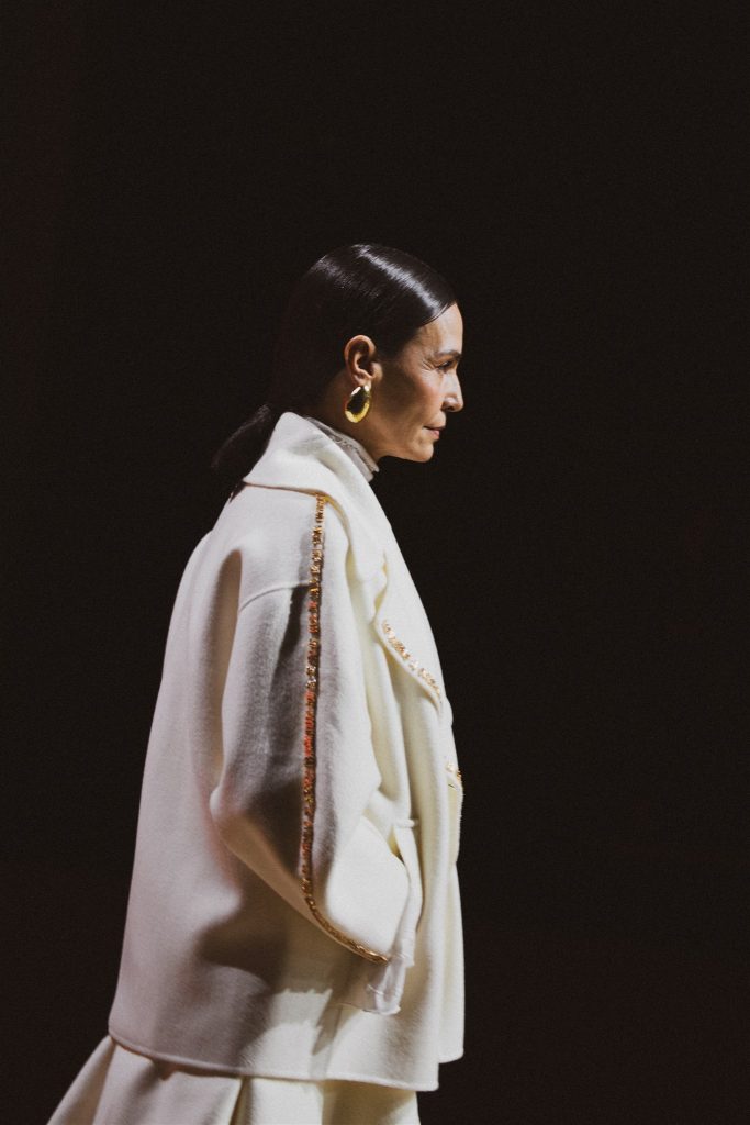 La marca también ha desarrollado un lenguaje propio basado en un sistema binario, generando códigos y grafías que se trasladan al tejido. Una metáfora que conecta el origen de los telares mecanizados con sistemas de escritura. Las siluetas, de líneas precisas y contemporáneas, se construyen a partir de superposiciones, tramas visibles y juegos de texturas que revelan la arquitectura del propio tejido.